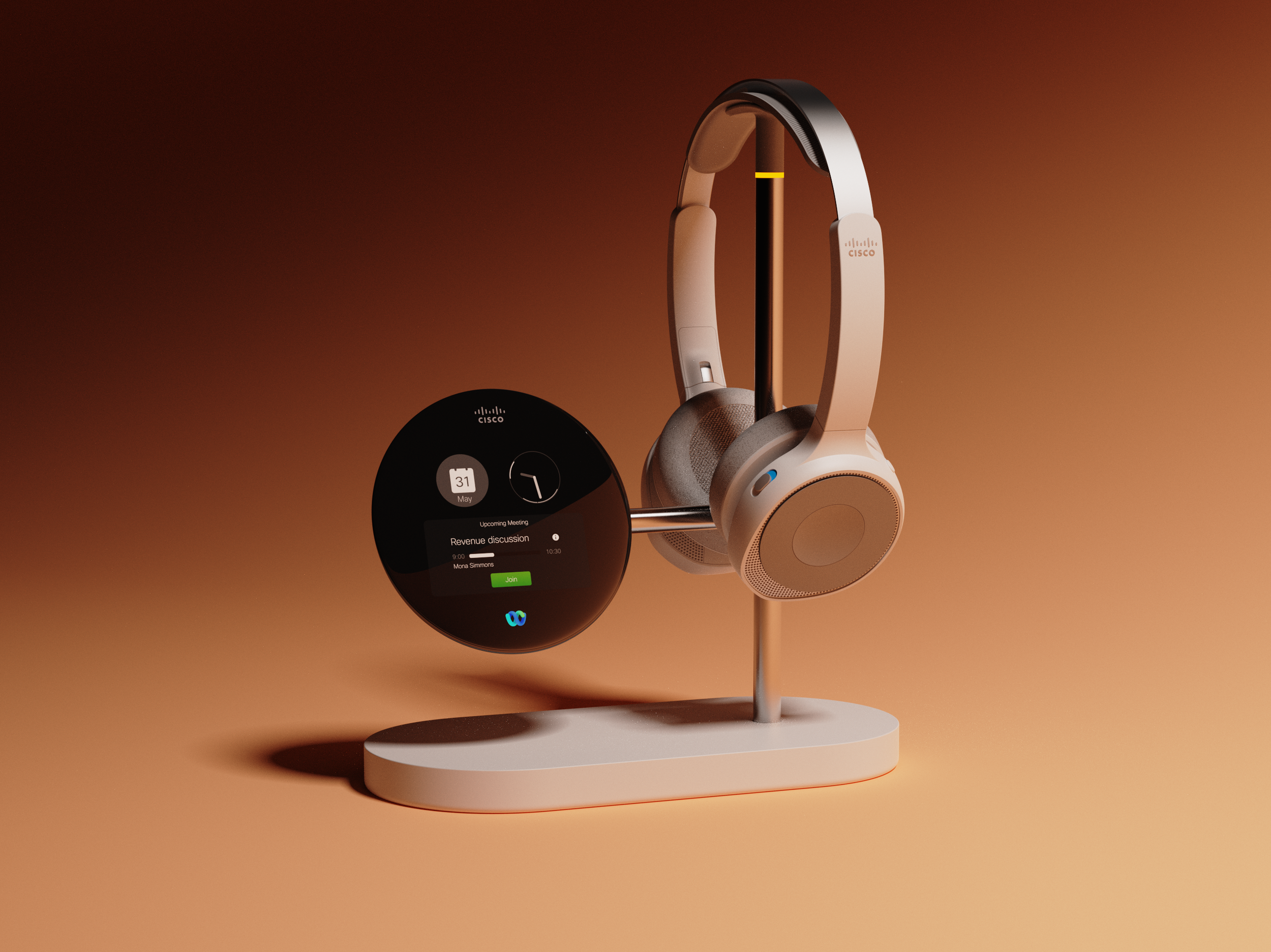 I designed a simple, stylish system inspired by jewelry and watch displays. It charges the headset, shows meeting details, and lets you join calls. It also highlights our headsets and Webex assistant.